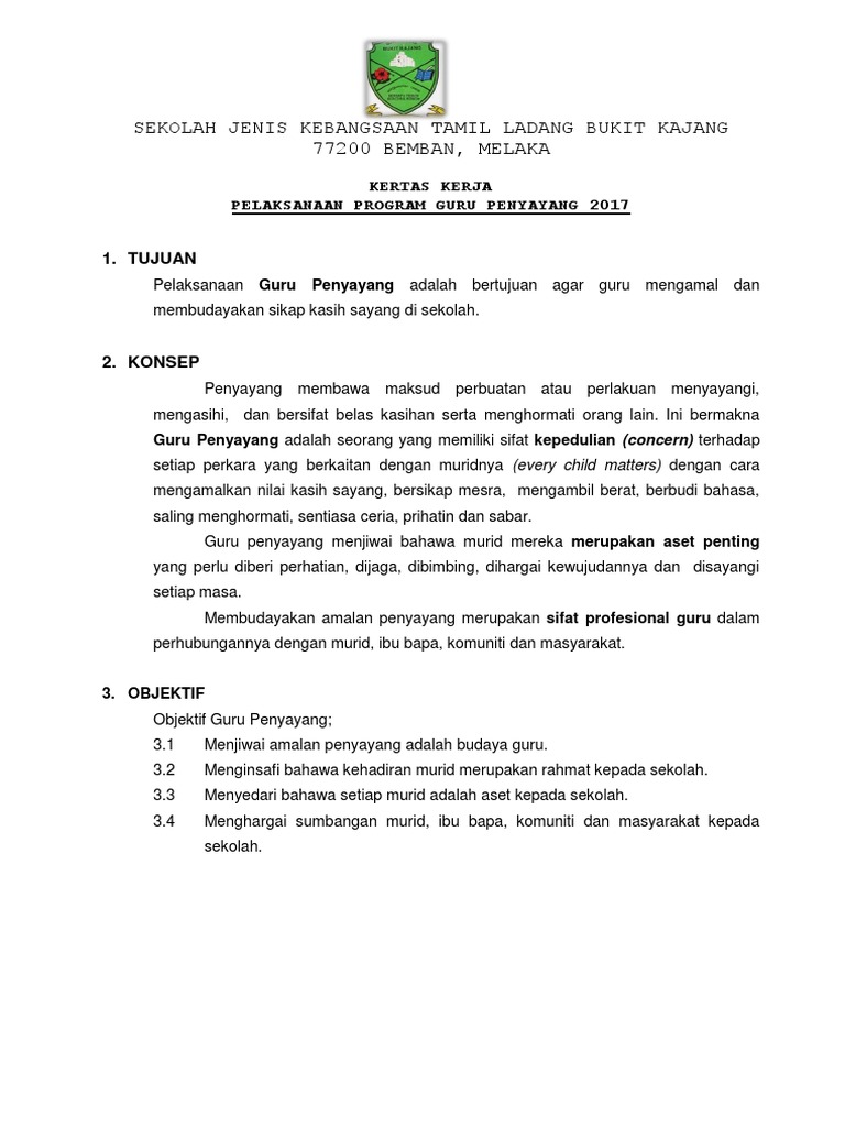 Kertas Kerja Program Pemantapan Disiplin. K ertas kerja guru penyayang 2016. KONSEP Penyayang membawa maksud perbuatan atau perlakuan menyayangi mengasihi dan bersifat belas kasihan serta menghormati orang lain.